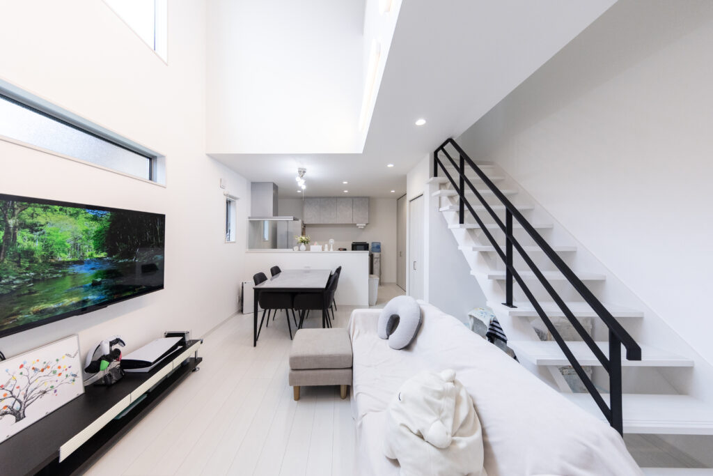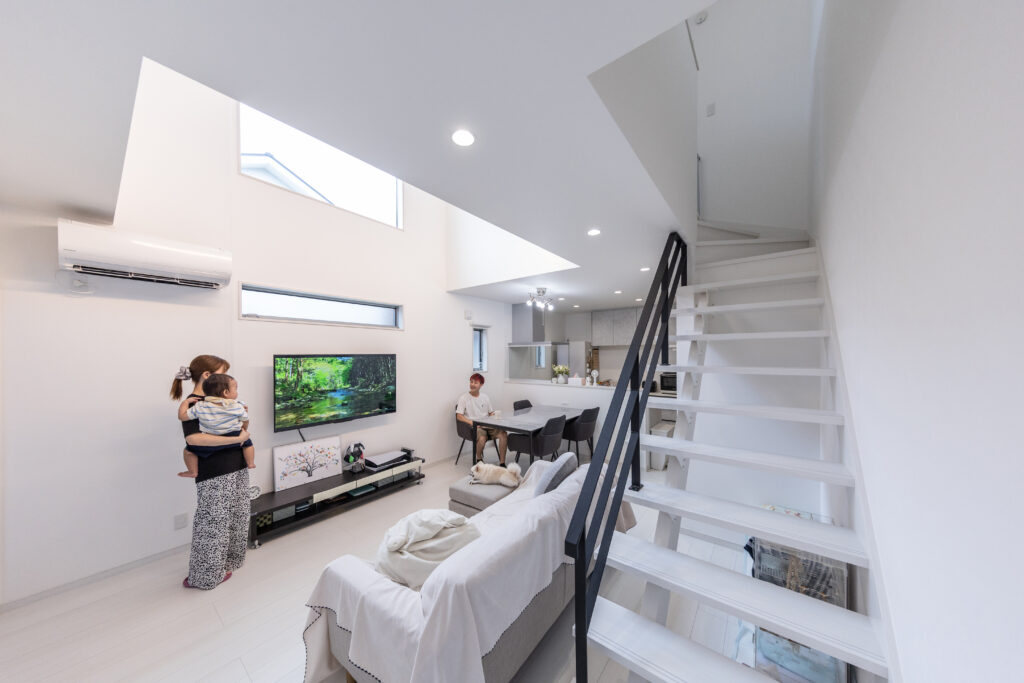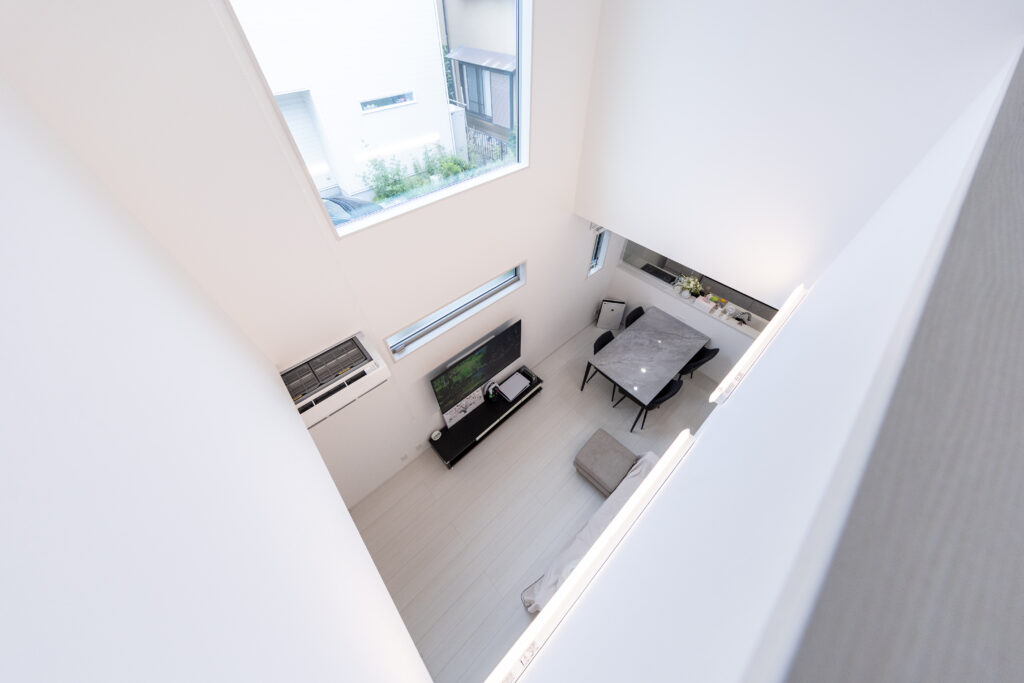 吹き抜けに大きな窓を設け明るいLDKに♪