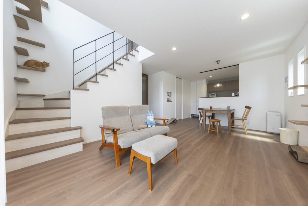 リビング階段の途中にキャットステップを。自然と視線が上にのび、猫ちゃんのくつろぐ姿にほっこり。大きな窓からたっぷりの光が入る吹き抜け階段で家族の時間を大切にできる暖かいLDKに(^^)/