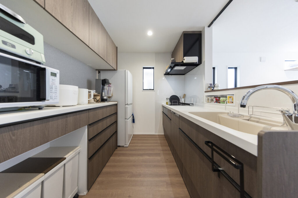 キッチン扉カラー:グレイッシュグレイン 木目調の落ち着いたトーンのキッチンで上品で温かみのある雰囲気に♪ 日々の料理が楽しくなるような洗練された大人のキッチンに。
