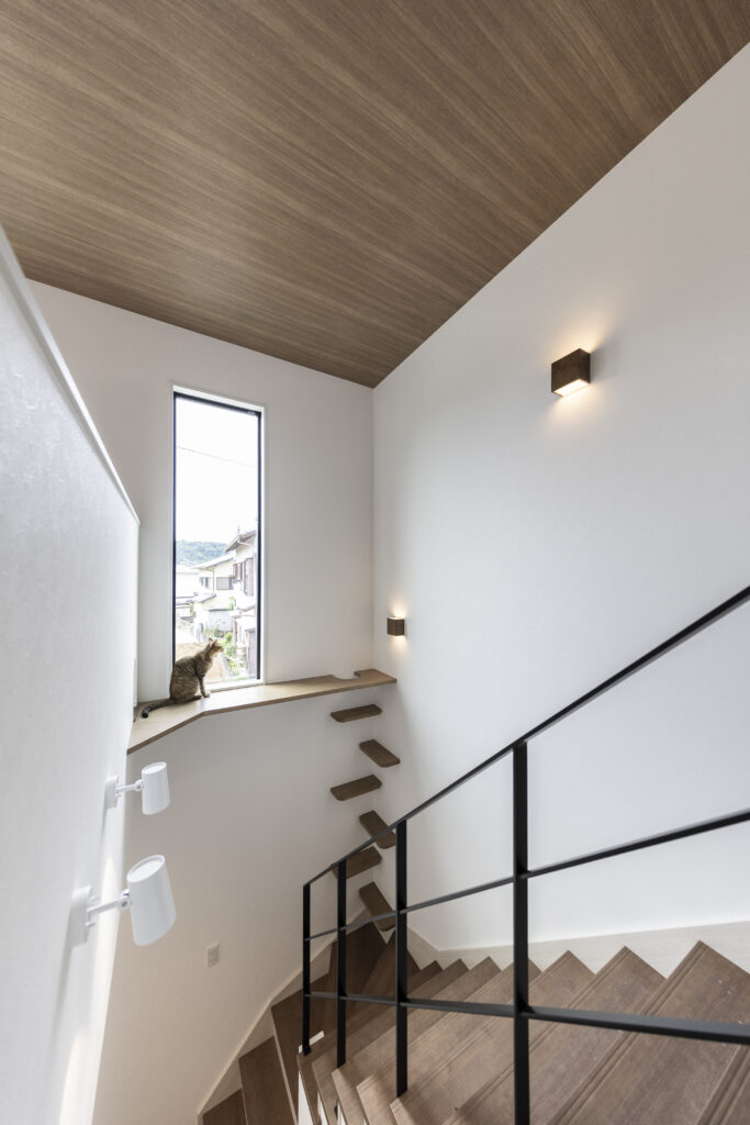 リビング階段上部に吹き抜けがあり、その先2Fホールにはフリースペースを設け 猫ちゃんたちが日差しをたくさん浴びることができるデザインをご提案させていただきました。外から見る窓の配置などこだわり抜いたお家に仕上がりました。