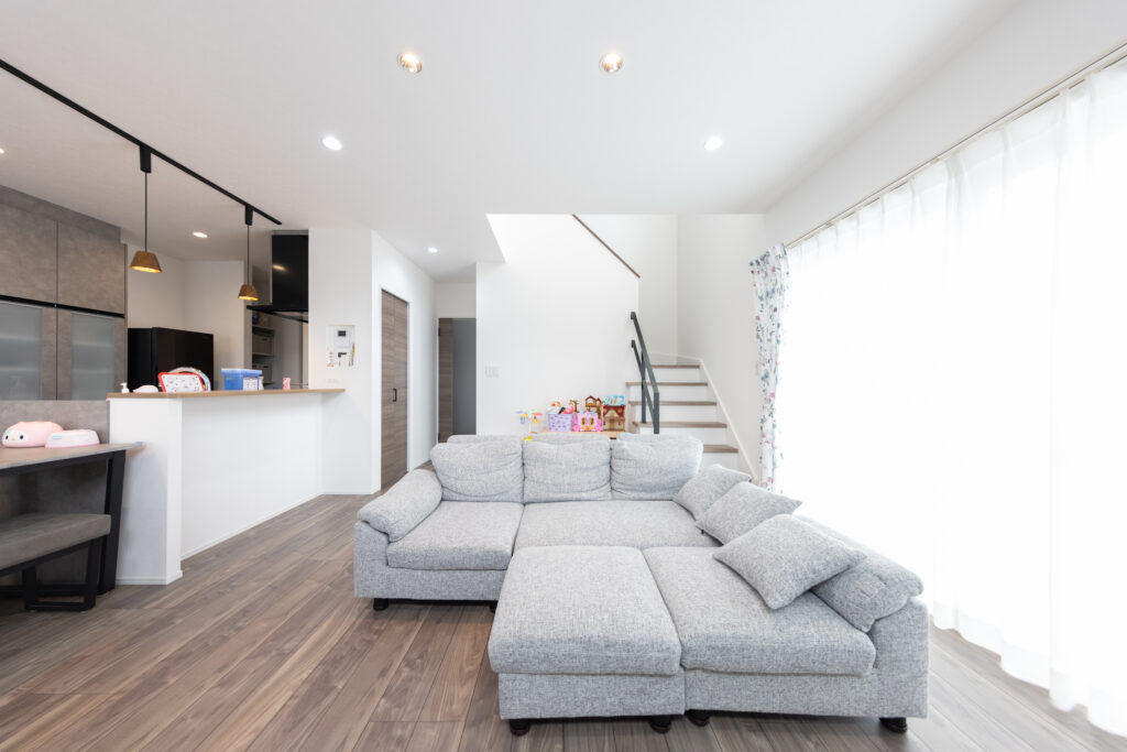 光がたっぷり差し込む、開放感あふれるLDK。キッチン・リビング・階段まで視線が抜け家族の気配を感じながら過ごせるお家に(^^)/